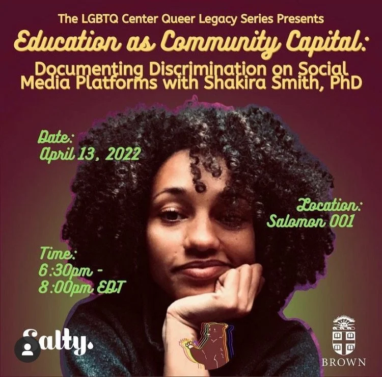 The Brown University LGBTQ Center Queer Legacy Series and Feminists@Brown, in Collaboration with Salty, is hosting Shakira Smith, PhD for a discussion on social media censorship and the margins of digital spaces, traditional research approaches as master’s tools, and leveraging research education for accessible, community benefit. Dr. Smith will also share about her academic trajectory and curating career outside of hegemonic norms.